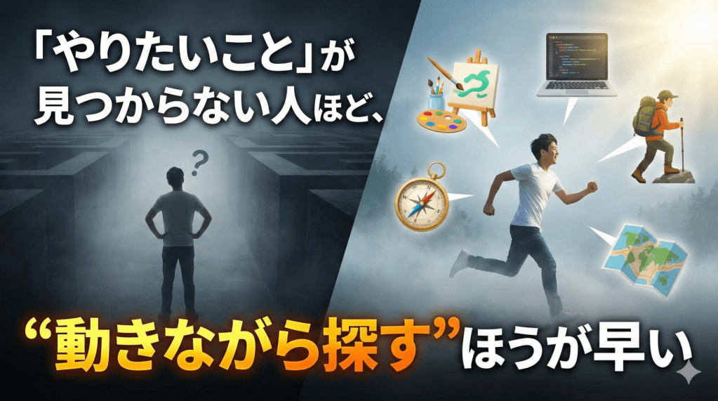 やりたいことを考えても見つからないのは、頭の中で完結しているからです。動きながら考えることで、初めて“実感としての興味”が見えてきます。行動してみることで、自分の得意不得意、人との相性、熱中できる瞬間などを体感的に理解できます。完璧な答えを探すよりも、小さな行動を積み重ねて「これなら続けられる」と思えるものを探すことが大切です。やりたいことは、考えるものではなく、動きながら見つけるものです。