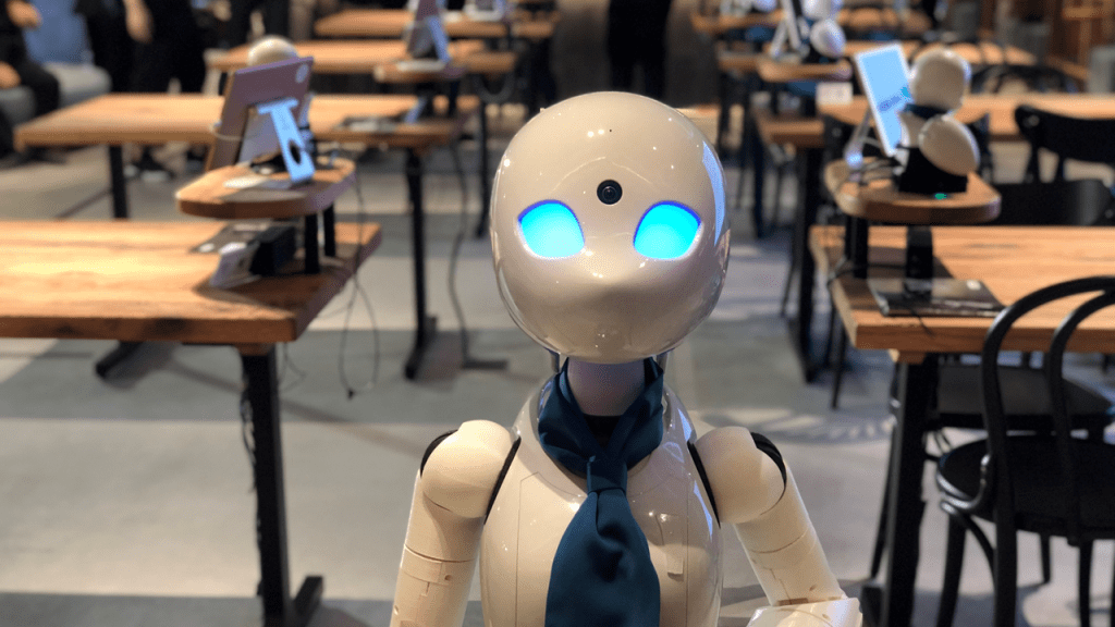 Meta Table βは、分身ロボットOriHimeを用いて遠隔で働く人のコミュニケーションをサポートするテーブルです。オリィ研究所では「すべての人に社会とつながり続ける選択肢を」をテーマに常設実験カフェ「分身ロボットカフェDAWN ver.β」を運営しています。このカフェでは、ALSなどの難病や重度障害で外出困難な人々が、分身ロボットを自分のアバターとして用い、インターネット経由で操作して働くことができます。今回の取り組みでは、分身ロボットで働きやすい環境づくりに着目し、分身ロボットを通してカフェで働く際にその場の雰囲気を共有しやすくなるテーブルを開発しました。AIによる感情技術を環境に活用し、分身ロボットを使う人が主役になれる場づくりを目指しています。